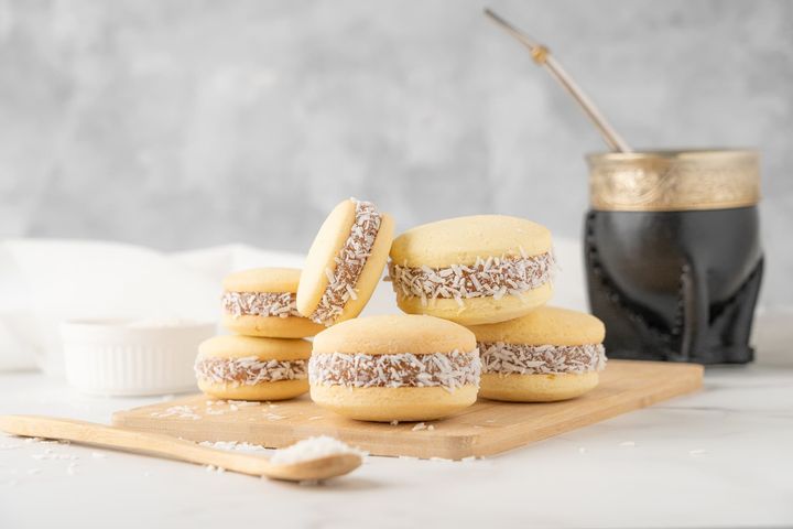 - 6 alfajores de maicena con dulce de leche casero y ralladura de coco orgánico.