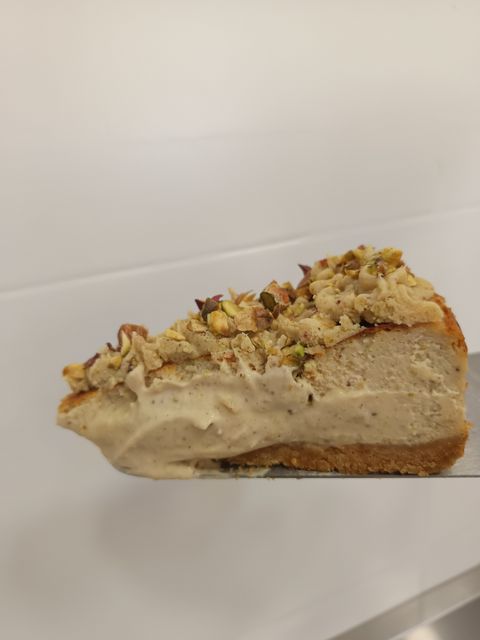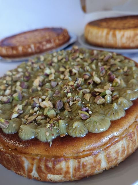 Nuestra tarta de queso de pistacho reúne la untuosidad de la clásica tarta de queso de "La Viña" con la profundidad del pistacho tostado. El sabor a pistacho recorre esta preparación en el relleno o crema principal, en la ganache de cobertura y en los trozos de pistacho esparcidos por encima. Ver más detalles